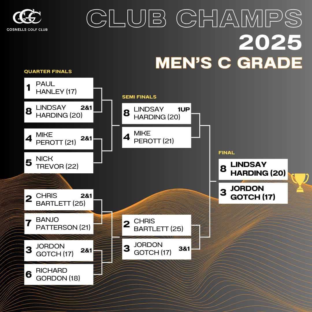 - Men’s C Grade 18 hole Final: Jordan Gotch vs Lindsay Harding